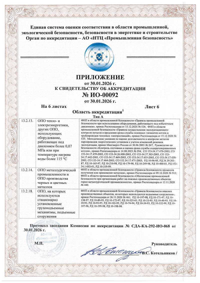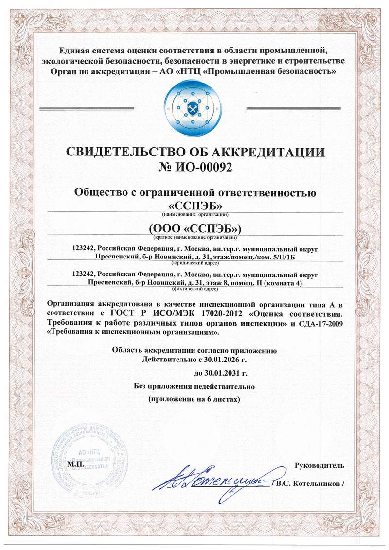 ООО «ССПЭБ» (Союз Специалистов Промышленной и Экологической безопасности) аккредитовано в качестве инспекционной организации типа А в соответствии с ГОСТ Р ИСО/МЭК 17020-2012 «Оценка соответствия. Требования к работе различных типов органов инспекции» И СДА-17-2009 «Требования к инспекционным организациям».